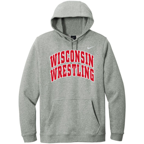Wisconsin Wrestling Grey Nike Club Hooded Sweatshirt.  High quality design created by Championship Products Custom Apparel.