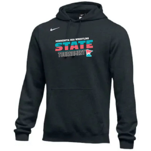 This is the MN/USA Wrestling Black Nike State Club Fleece Hooded Sweatshirt with Front Print.
