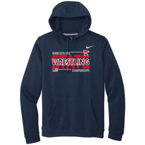 This is the 2025 MN/USA Wrestling Navy Nike State Club Fleece Hooded Sweatshirt with Front Print. Adult Sizes Only