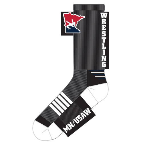 Black Moisture Wicking Team Crew Sock with MN/USA Wrestling logo and Storm logo woven in.